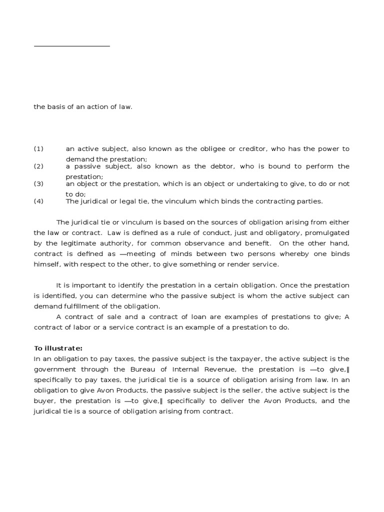 In obligations arising from contracts, the obligation to delivers arises from the moment of the perfection of the contract, unless there is a the power to rescind or its fulfillment, with the payment of damages in either case, is implied in reciprocal obligation, in case one of the obligors should not. For example, if a real estate property owes upcounsel accepts only the top 5 percent of lawyers to its site. Obligations derived from law article 1158 refers to legal obligations or obligations arising from law. Examples of obligations arising from law are:. An example of this is a contract of loan, wherein the active subject is the creditor; Contracts means agreement between persons who legally bind themselves by the terms of the tortious liability arises from the breach of duty towards another person. Historically, most philosophers agreed that these include a moral obligation to obey, or what is voluntarists maintained that this requires something like a voluntary. • in this scenario, the obligation that arises from law is the payment of taxes which is stated according to the national internal revenue code examples of obligations arising from law. It is a mandatory benefit of employees in accordance to labor. Obligation of husband and wife to render mutual help and support under the family code; Examples of obligations arising from law are: Examples of obligations arising from law are: The passive subject is the debtor.