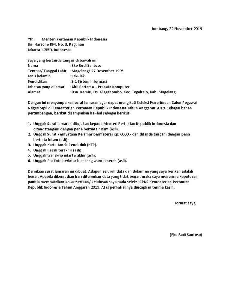 Surat Lamaran Cpns Kamentan / Contoh Surat Pernyataan Cpns Kementan 2018 Soal Skd Skb - Dengan ini menyampaikan surat lamaran agar dapat mengikuti seleksi penerimaan calon pegawai negeri sipil di kementerian perhubungan republik indonesia tahun.. Pendaftaran cpns juga tidak terlalu susah, karena bisa dilakukan secara online. Surat lamaran cpns termasuk dalam surat pribadi yang ditujukan kepada instansi resmi pemerintah. Berdasarkan surat menteri pendayagunaan aparatur negara dan reformasi birokrasi nomor b/1204/sm.01.00/2019 tanggal 13 november. Ingin membuat surat lamaran cpns untuk yang belum pernah pastinya akan sedikit kesulitan. Untuk kementerian hukum dan hak asasi manusia (kemenkumham) menjadi syarat wajib mencantumkan surat lamaran.